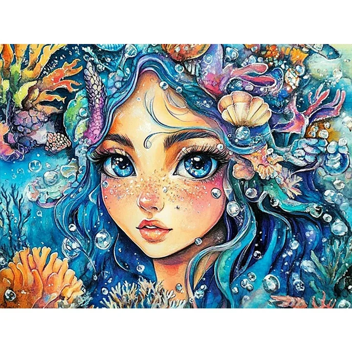 5D Diamond Painting Blue-Haired Ocean Girl (Velvet Cloth) Fairy Dust Drills Full Round&Square Wall DIY Art Crafts Mosaic Picture Kit Home Decoration Gift