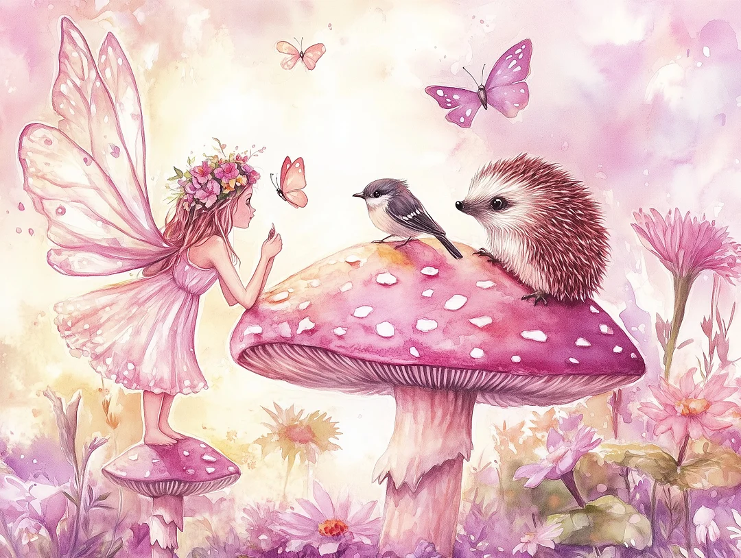 5D Diamond Painting Marie AI.Kunstwerke-Fairy and Hedgehog on Mushrooms (Velvet Cloth) Fairy Dust Drills Full Round&Square Wall DIY Art Crafts Mosaic Picture Kit Home Decoration Gift