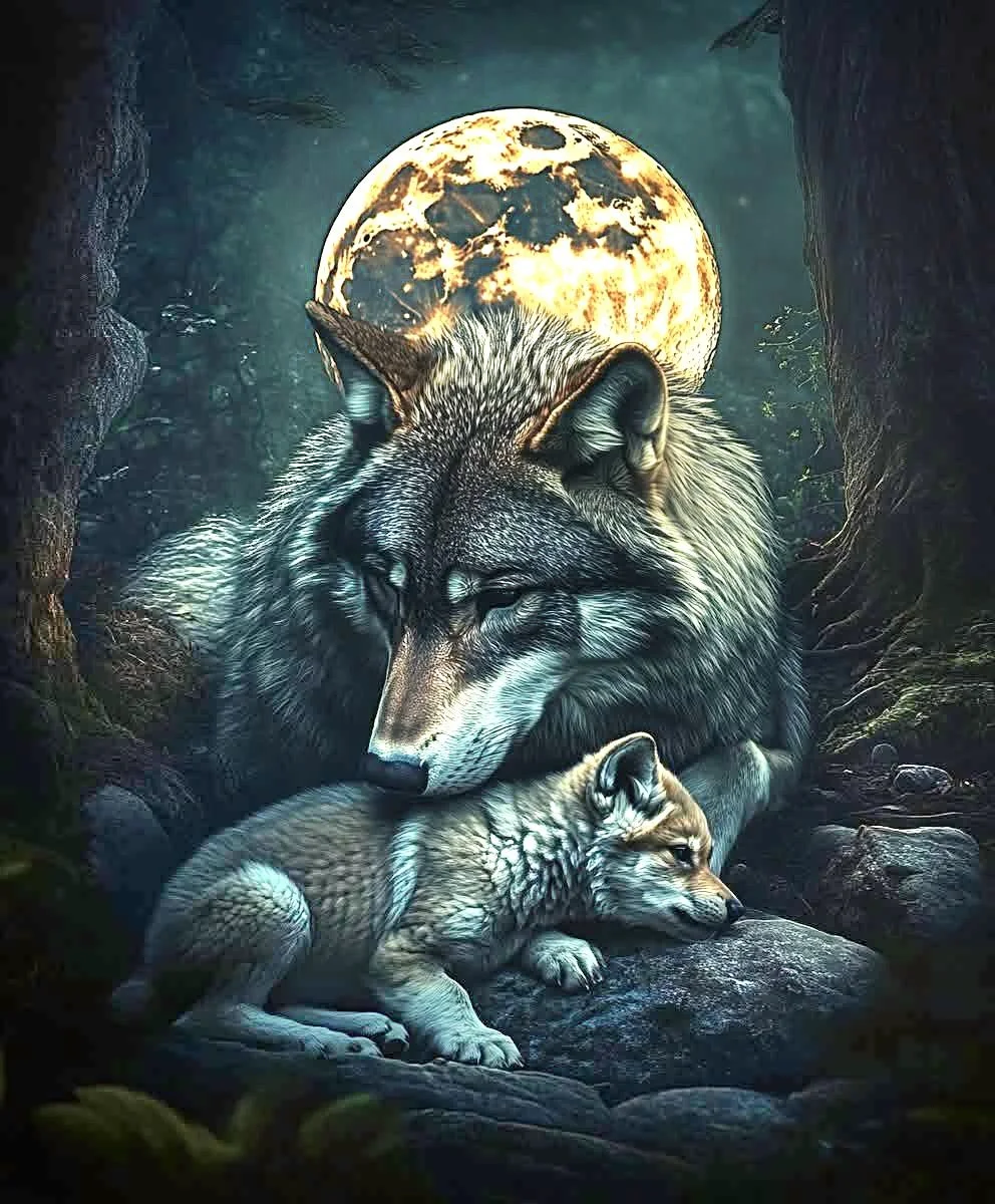 5D Diamond Painting Moon Wolf and Cub (Velvet Cloth) AB Drill Full Round&Square Wall Rhinestone DIY Art Crafts Mosaic Picture Kit Home Decoration Gift
