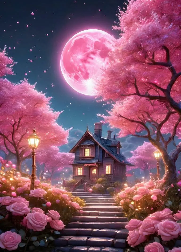 5D Diamond Painting Pink Moon House Tree Landscape (Velvet Cloth) AB Drill Full Round&Square Wall Rhinestone DIY Art Crafts Mosaic Picture Kit Home Decoration Gift