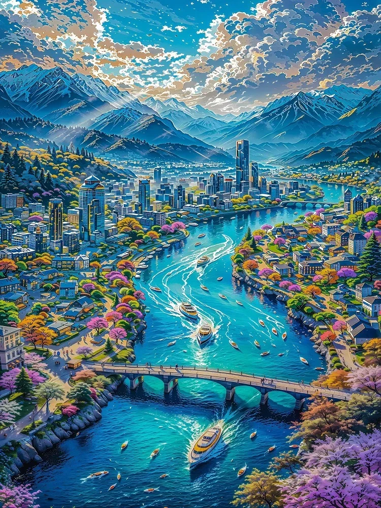 5D Diamond Painting Sunny Sky River Town (Velvet Cloth) Fairy Dust Drills Full Round&Square Wall DIY Art Crafts Mosaic Picture Kit Home Decoration Gift