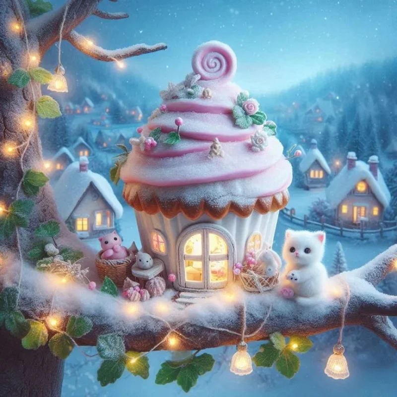 5D Diamond Painting Sweet House Cute White Cat (Velvet Cloth) Fairy Dust Drills Full Round&Square Wall DIY Art Crafts Mosaic Picture Kit Home Decoration Gift